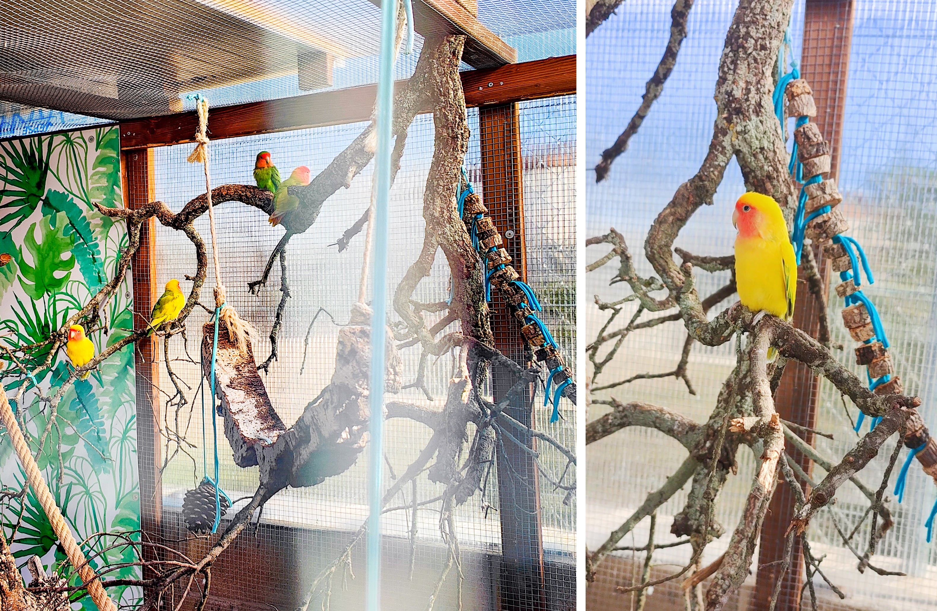A nuestros peques les encanta estar en las zonas altas, y si es en un árbol mejor. Una rama que aparentemente es un árbol se puede colocar del revés (desde el techo), y te prometo que es maravilloso. Nosotros mismos lo tenemos en la voladera y es su rama favorita, donde todos juntos comparten el espacio para tomar el sol.