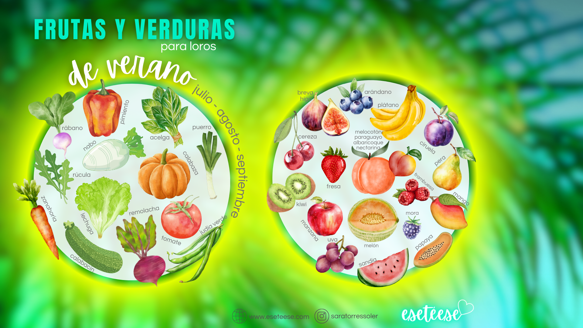 Aquí encontrarás una recopilación de frutas y verduras de temporada aptas para psitácidas (lista basada en nuestro país, España), que podrás descargar en PDF e imágen y así poder imprimir o guardar en tu móvil.